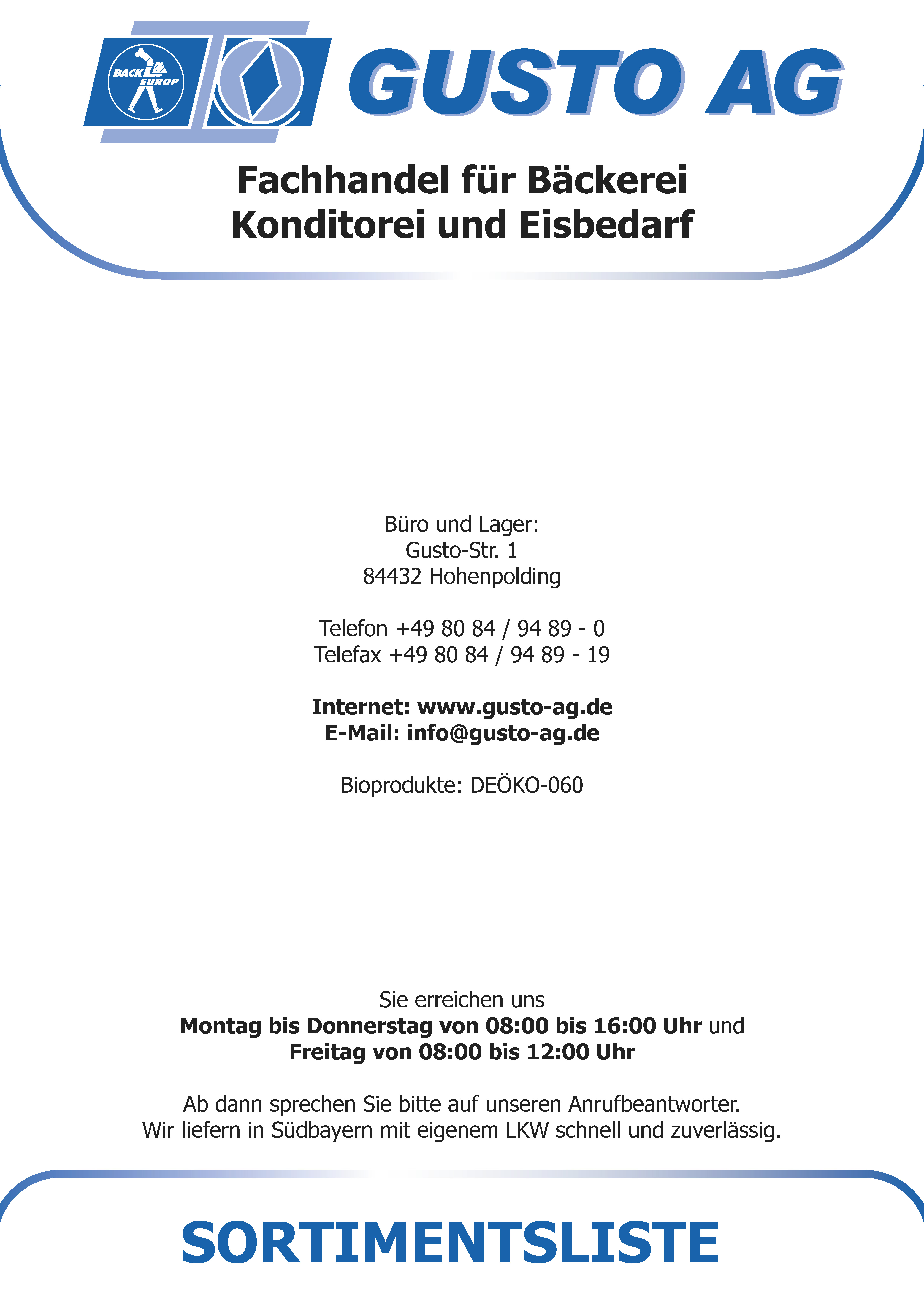 Als Gesellschafter der Backeurop-Handelsgruppe bedient die GUSTO AG hauptsächlich Kunden in der Region München und Südbayern, wobei eine hohe Serviceorientierung mit ausgefeilter Logistik Lieferungen innerhalb von 24 Stunden gewährt.